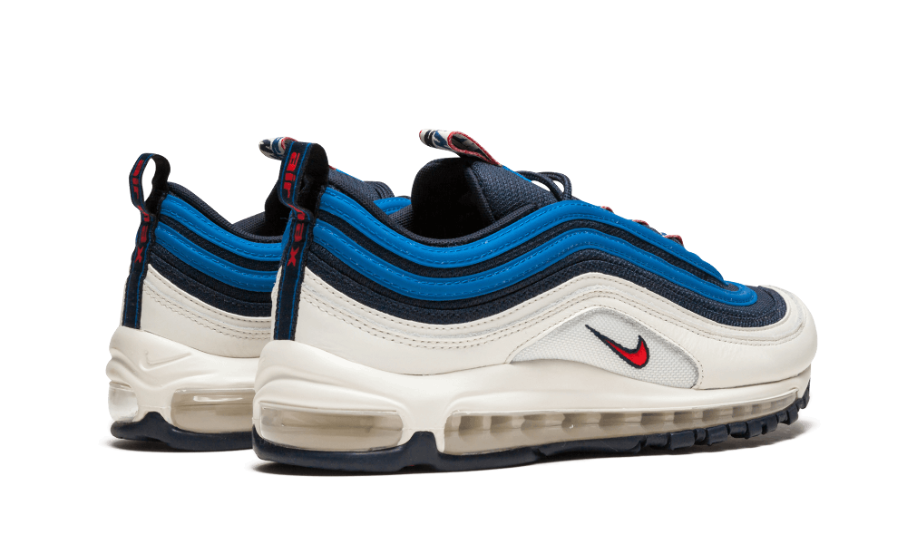 This Nike Air Max 97 SE "Blue Nebula" released in 2018 as a part of the brand's "Pull Tab" pack. The collection of sneakers was given its name because each pair features a branded pull tab on the tongue not usually seen on the original versions of each silhouette. This version of the 1997 runner is constructed of an obsidian mesh with white and blue leather overlays. Red accents come through on the mini Swoosh, tongue, and outsole.